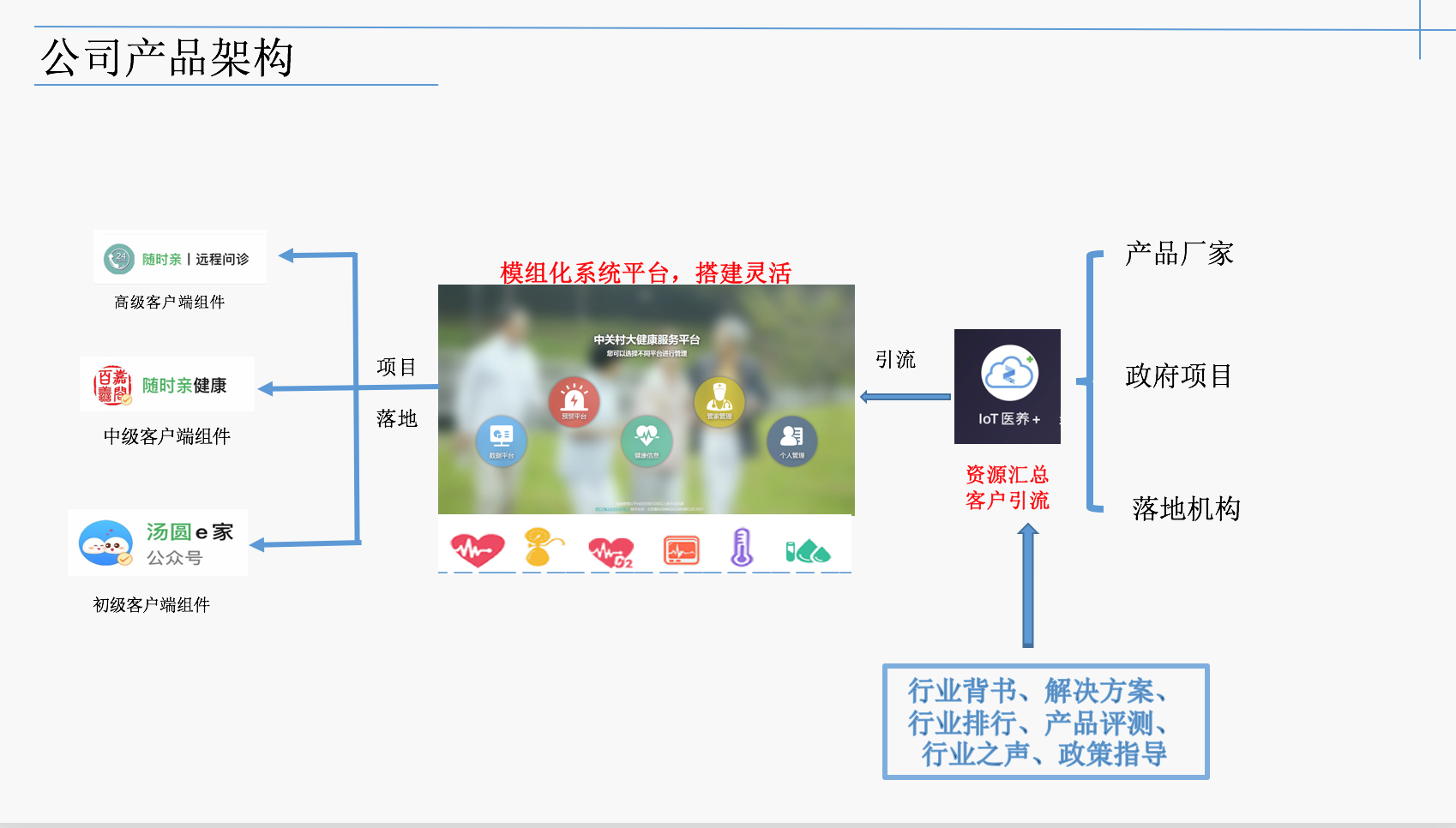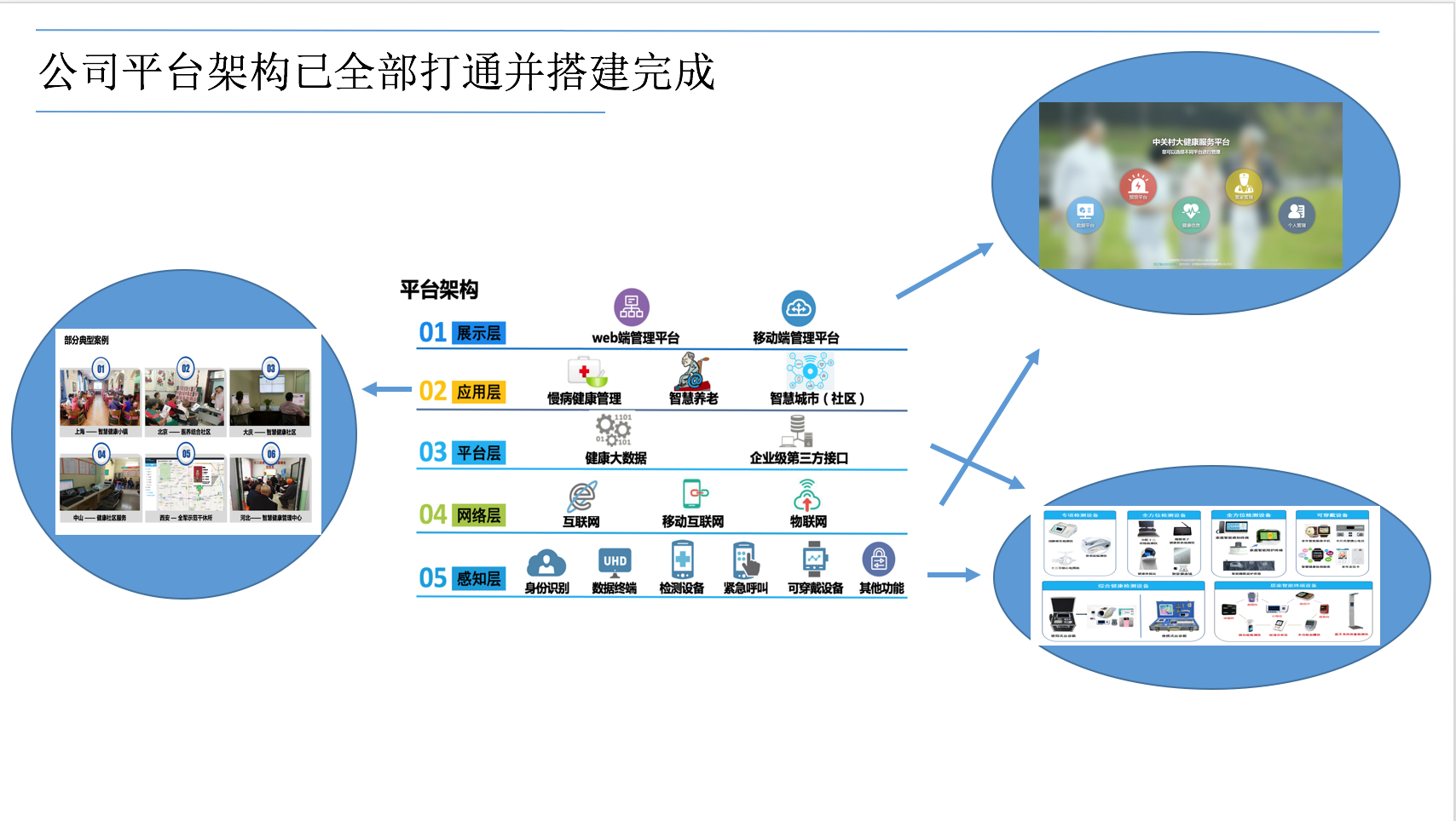 公司致力于運用國內(nèi)外高科技手段,以現(xiàn)代物聯(lián)網(wǎng)技術為核心,完成健康管理信息化平臺的研發(fā)、推廣和建設,整合大健康資源,并完善服務體系,為政府、企業(yè)機構、社區(qū)、家庭、個人提供第三方健康管理信息平臺和智慧養(yǎng)老解決方案。
